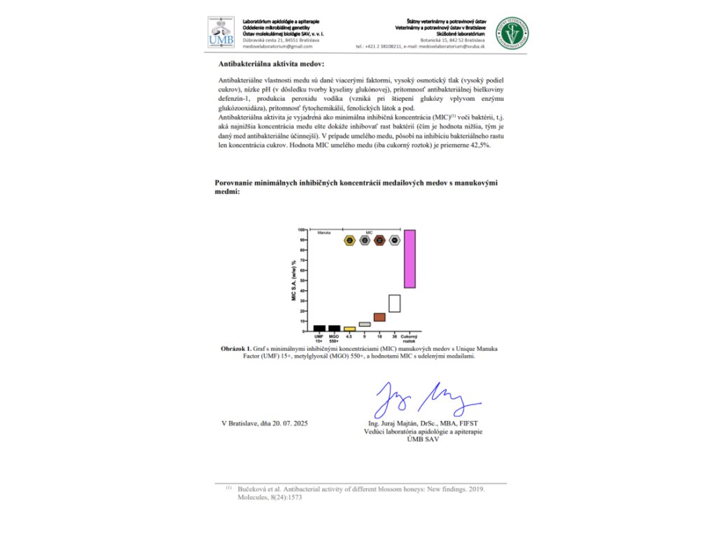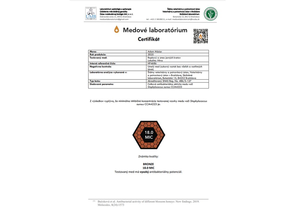 Tento kvetový med pochádza z pestrej palety poľných a lúčnych kvetov, čo mu dodáva jemnú chuť, svetlú farbu a univerzálne využitie. V laboratórnych testoch MIC, ktoré merajú schopnosť medu zastaviť rast baktérií, získal bronzovú medailu.